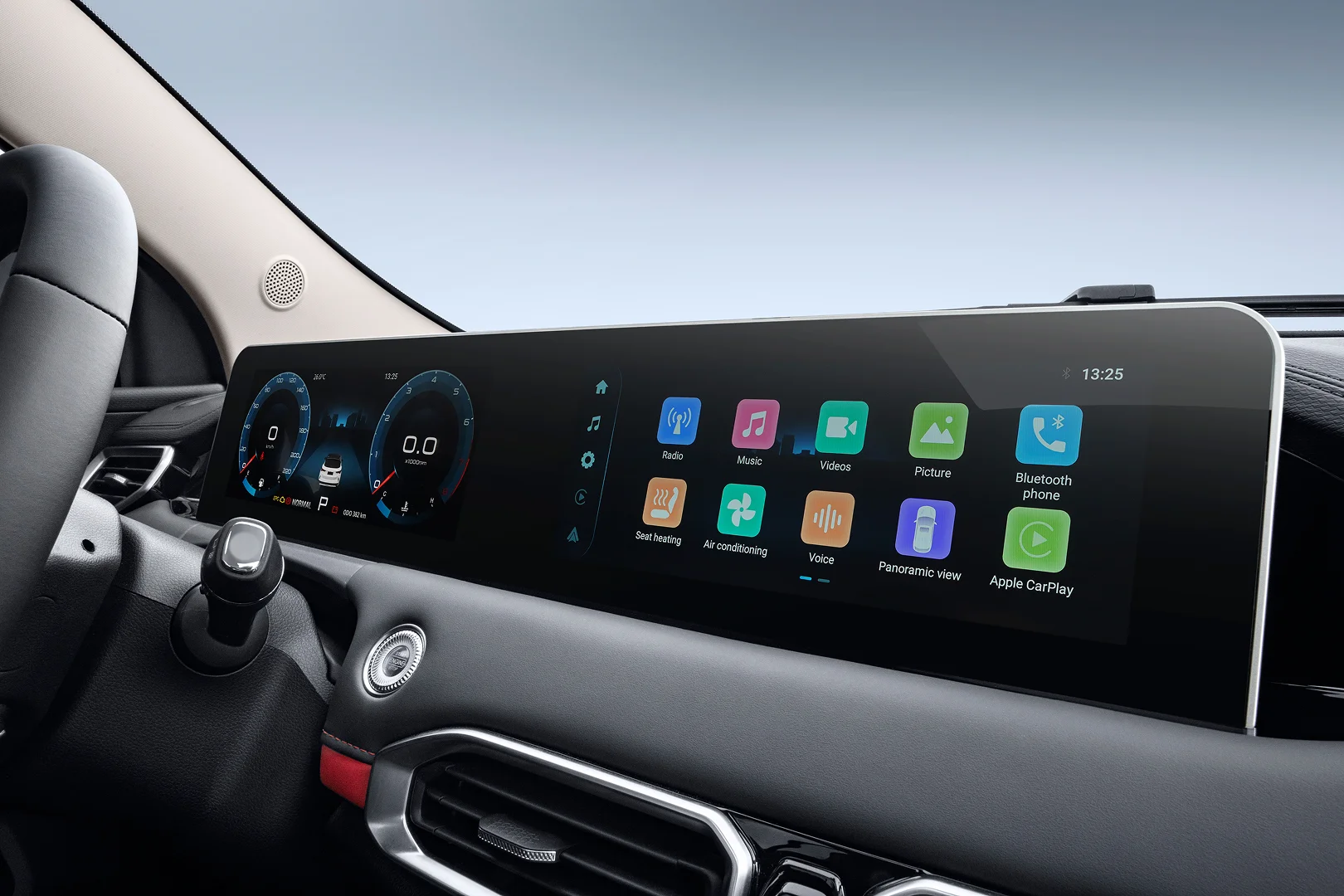Цифровая панель поддерживает CarPlay, Android Auto и беспроводное подключение, с проекцией интерфейса телефона